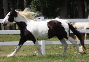 Saber is a great gelding that is decently sized. He is a people oriented horse, yet isn’t pushy for affection. He will gladly follow for a scratch and seems to be level headed in most situations. He LOVES to load onto the trailer – whether to ride or just stand…- Breed: Gypsy Vanner, Gypsy Cob