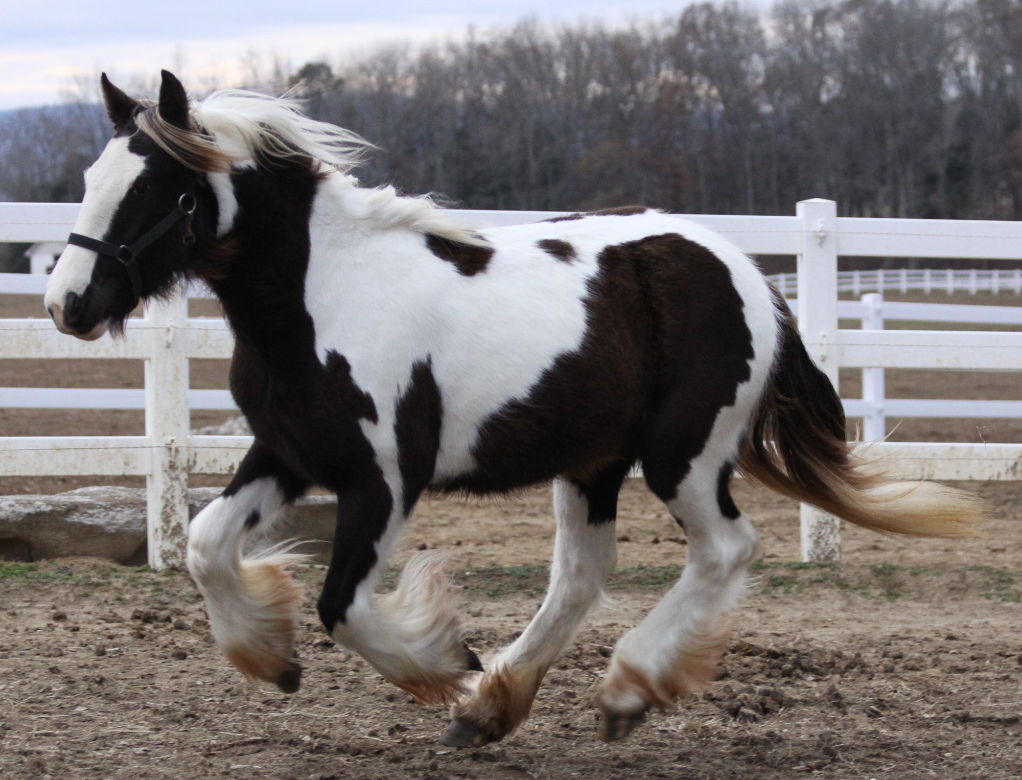 Lil Diamond is a very loving filly. She has her sire’s wonderful personality. Her dam is Derek’s Girl and her Sire is The Producer. She stands for the farrier, vet, baths and loves to be groomed. We are currently working on loading and she leads great.- Breed: Gypsy Vanner, Gypsy Horse