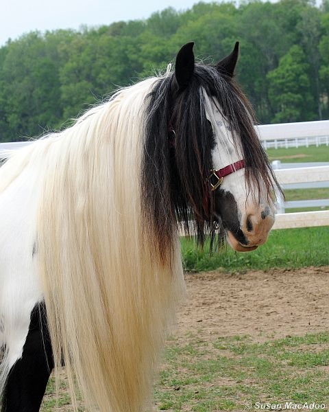 Memory is a beautiful Gypsy Vanner mare standing approximately 14.3 hands tall. She has wonderful Gypsy Cob conformation with a good thick body, correct legs, the most beautiful flowing mane and plenty of hair! Her right eye is a very pretty blue. Memory has been color DNA tested and is confirmed homozygous for the tobiano trait….- Breed: Gypsy Vanner