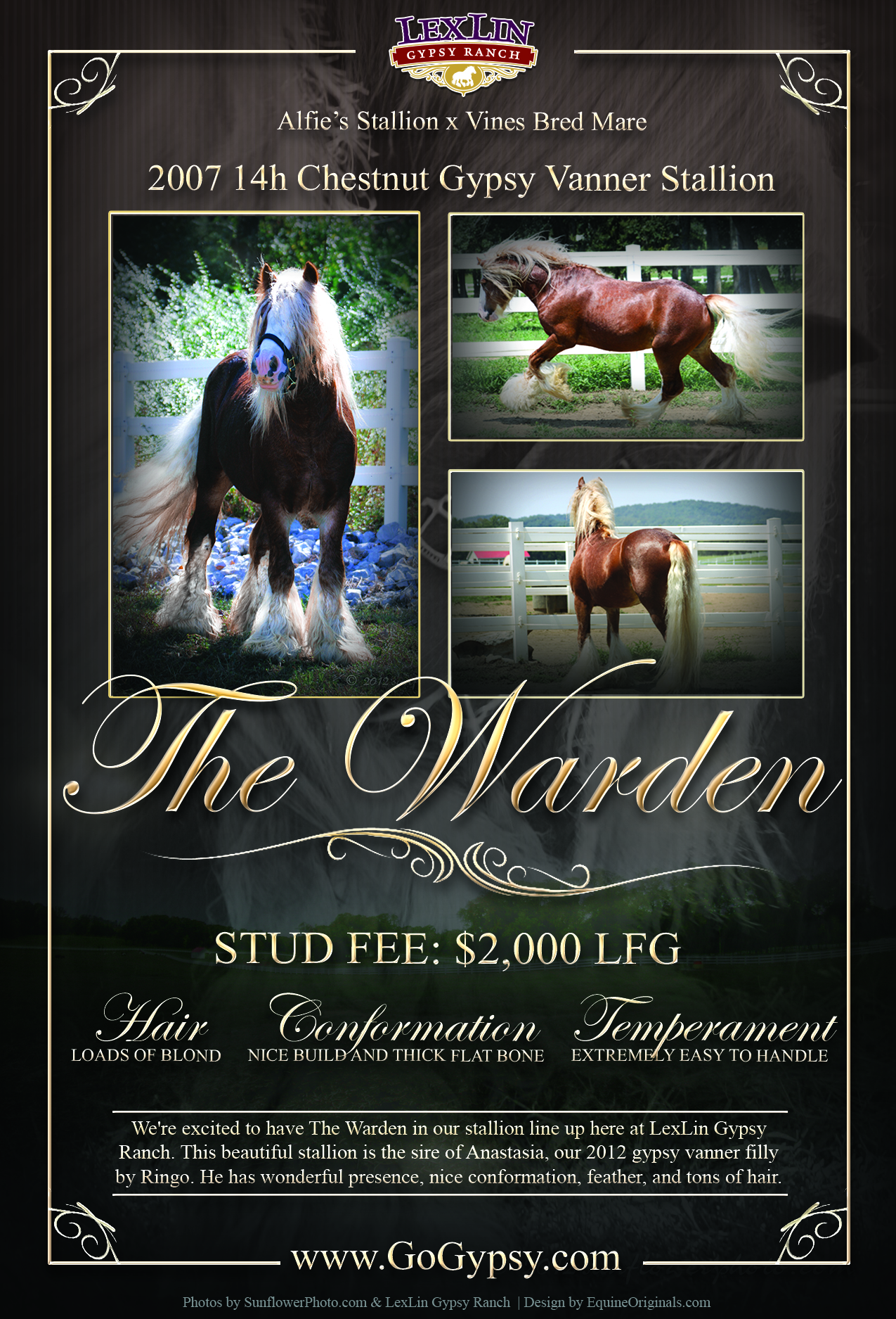 We’re excited to introduce The Warden to our stallion line up here at LexLin Gypsy Ranch. This beautiful stallion is the sire of Anastasia, our 2012 gypsy vanner filly by Ringo. He has wonderful presence, nice conformation, feather, and tons of hair.